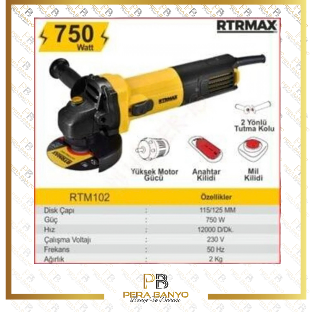 Rtrmax RTM102 750 W 115-125 MM Profesyonel Avuç Taşlama Makinesi 750 Watt güçlü motor ile kolay kesme ve taşlamaDakikada 12000 devir ile kolay kesim avantajı115 mm ya da 125 mm taş kullanabilme imkanıİnce tasarımı sayesinde kullanıcıyı yormazMotor havalandırma kanalları filtre ile korunarak motor güvenliği sağlanmıştırBu filtreler çıkartılıp temizlenebilmektedirİki yönlü kullanılabilen tutma koluAlüminyum dişli kutusu ısınmaya karşı dayanıklıdır360 derece ayarlanabilen taş muhafazasıKolay taş değişimi için pratik kilitleme miliTek elle kolayca açılıp kapanan motor tetiğiTeknik ÖzelliklerDisk Çapı 115/125 MMGüç 750 WHız 12000 D/DKÇalışma Voltajı 230VFrekans 50 HZAğırlık 2 KG Teknik Özellikler Devir 12000 Devir/Dakika Disk Çapı 125 MM Ağırlık 2 KG Enerji Kaynağı Elektrik Yan Sap Var Renk Sarı Kablo Uzunluğu 3 M Model RTM102 Güç (Watt) 750 Marka Rtrmax